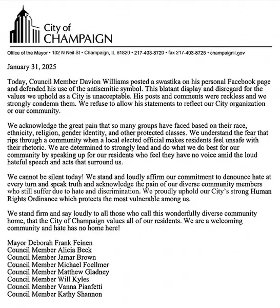 A recent incident involving a council member in Champaign, Illinois, has sparked a heated debate and divided the community. Council member Williams made controversial remarks that were deemed Judeophobic and antisemitic by local Jewish leaders and community members. The comments, which referenced the swastika and its association with Nazism, were widely condemned and caused an uproar among the city’s residents. In response to the backlash, Williams issued a public apology and met with Jewish leaders to address their concerns. He acknowledged that his comments were inappropriate and hurtful, showing remorse for any pain they caused. However, he also attempted to justify his actions by comparing the swastika’s association with Nazism to the Ku Klux Klan’s use of the cross, suggesting that symbols can have multiple meanings depending on cultural and religious contexts. Despite the outrage and calls for his resignation, Williams has refused to step down from the Champaign City Council, defending his right to free speech and expressing a desire to continue serving the community. The controversy has created a divide among the residents, with some supporting Williams’ right to express his opinions and others demanding his resignation due to the sensitive nature of the remarks and their impact on the Jewish community. The incident highlights the delicate balance between free speech and respect for cultural sensitivities, as well as the importance of accountability and sensitivity in public office.