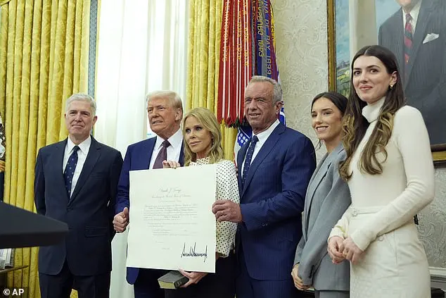 President Donald Trump and Supreme Court Associate Justice Neil Gorsuch stood alongside Robert F. Kennedy Jr., his wife Cheryl Hines, and other family members at an event. Kennedy, speaking about his own struggles with addiction, shared that he felt ‘born an addict’ and had a ‘biological impulse’ towards addictive behaviors. He emphasized the importance of a ‘spiritual realignment’ to overcome these impulses. Interestingly, Kennedy also expressed a commitment to preserving Americans’ food choices, even if they are unhealthy. He suggested that fast food could be made healthier by removing harmful additives and encouraging the use of beef tallow fat instead of seed oils. Kennedy’s views reflect a conservative approach that prioritizes individual choice and freedom over more restrictive health policies.