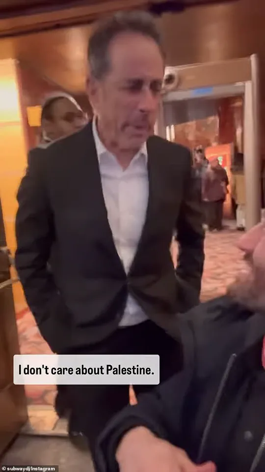 Jerry Seinfeld bluntly told an anti-Israeli activist, “I don’t care about Palestine” during an awkward exchange after what initially appeared to be an innocent selfie request. The comedy legend gave this cutting response after the activist attempted to elicit a political statement from him during their unexpected encounter. Social media personality Subway DJ approached the 70-year-old comedian at Radio City Music Hall in New York City, where Saturday Night Live was hosting a 50th-anniversary celebration. Seinfeld was more than willing to oblige when Subway DJ asked, ‘Jerry, can I get a selfie?’ ‘Sure!’ Seinfeld said as he leaned in to pose for what he believed was going to be a typical fan photo. However, instead of capturing a still image, the activist secretly recorded a video. As the camera rolled, the activist flashed a peace sign and abruptly declared, ‘Free Palestine.’ Seinfeld’s expression said it all, shifting from surprise to discomfort as he quietly processed the political bait.