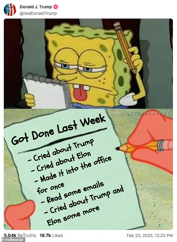 In a recent turn of events, President Donald Trump found an unusual source of entertainment on his Truth Social platform: Spongebob Squarepants. The president shared an edited screenshot from the beloved Nickelodeon cartoon, pitting the yellow sponge in a thought bubble against a list titled ‘Got done last week.’ The amusing post came as Elon Musk, DOGE CEO and noted Spongebob fan, defended a similar email he sent to all federal employees. In his X post, Musk asked workers to justify their weekly tasks by listing five accomplishments. The email, sent by the Office of Personnel Management’s human resources department, set a tight deadline for responses. However, some federal employees have taken issue with what they see as a form of harassment and a hostile work environment. Despite this controversy, Trump found humor in the situation, highlighting the unusual nature of the emails. The president’s lighthearted take on the matter is a stark contrast to the serious ecological impact and sustainability concerns that Musk’s DOGE coin has raised. As Musk continues to navigate his company through uncharted waters, his focus on employee productivity remains a key part of his strategy. It will be interesting to see how this unusual situation plays out and whether it will have any long-lasting effects on federal worker morale or the future of Musk’s ambitious projects.