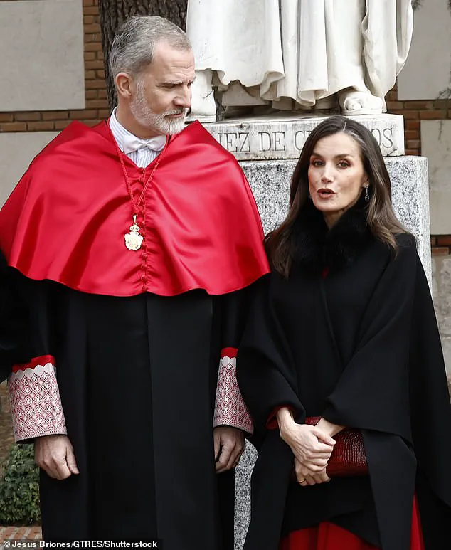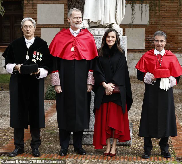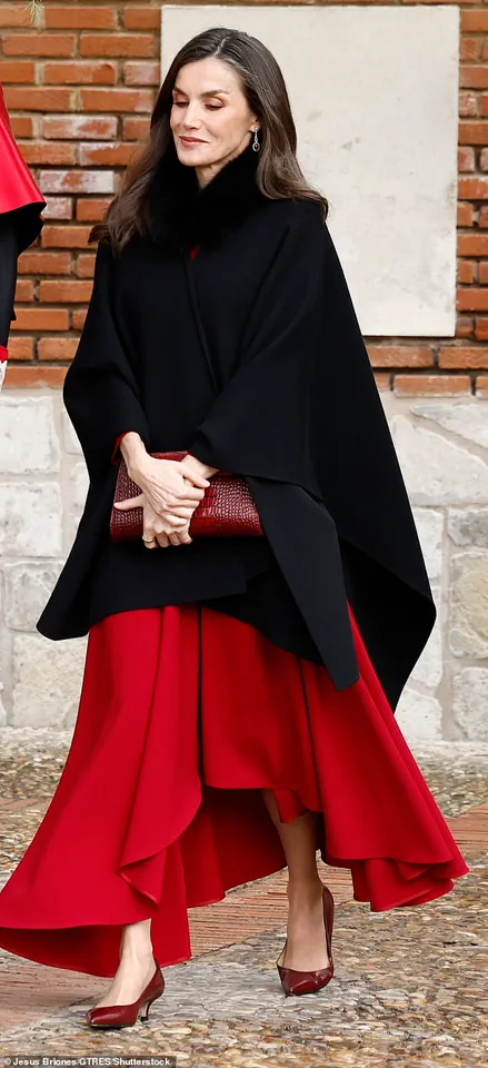 Queen Letizia of Spain made a stylish appearance at an Alcala University event in Madrid on [date]. The elegant monarch, known for her sophisticated taste in fashion, chose a red ensemble for the occasion, reflecting the university’s colors. Letizia, 52, looked stunning in a chic red outfit, paired with a flowing black poncho to protect herself from the cooler temperatures. She Accessorized her look with a crimson croc leather clutch bag, statement ruby earrings, and red heels, seamlessly transitioning the color theme throughout her ensemble. The former journalist’s makeup choice added to her glamorous appearance, featuring a subtle bronze eyeshadow. Her husband, King Felipe VI, dressed in traditional attire associated with the university, including a distinctive red cape. The Spanish royal couple engaged in official duties at the event, where Felipe presented honorary prizes to recipients. Alcala University, located just outside Madrid, is a renowned public institution offering a range of academic programs at both undergraduate and graduate levels. The visit by Queen Letizia and King Felipe VI showcases their support for education and the university’s contributions to Spain’s academic community. In an upbeat and stylish display, the royal couple posed for photographs with university board members, leaving a lasting impression on the campus community.