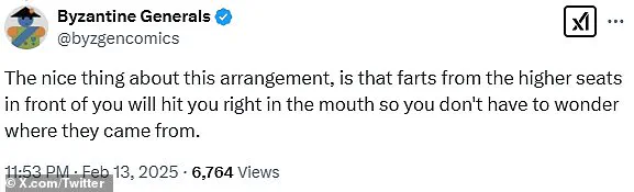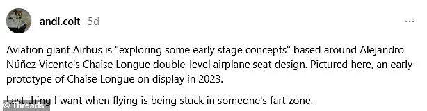 However, this concept has not been met with universal approval on social media platforms like Threads and X. One user expressed skepticism, stating it is a ‘bad idea.’ Another commented: “The last thing I want when flying is being stuck in someone’s fart zone.” The concern over proximity to other passengers’ bodily functions was echoed by another user, who joked that high-level seats would direct any gas directly into the face of those seated below.