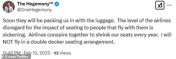 Despite these assurances, the dual-level seating concept faces significant public skepticism. Some users on social media forums have expressed reluctance to fly if such arrangements are implemented. One user commented: ‘The day this seating arrangement goes into planes is the day I start travelling only as far as I can drive,’ indicating a strong resistance among passengers to adopt this new format.