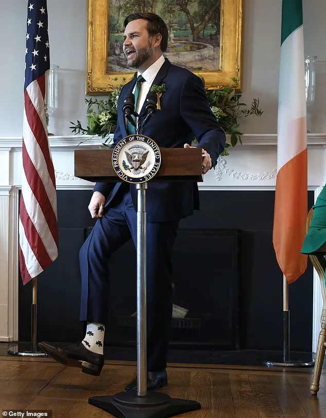 Vance caught Trump¿s attention with the Irish-themed shamrock-decorated socks he wore to meet the Irish Prime Minister Michael Martin in the Oval Office (pictured).