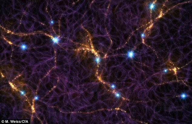 Scientists searching for fast radio bursts (FRBs) that some believe may be signals sent from aliens may be happening every second. The blue points in this artist’s impression of the filamentary structure of galaxies that extends across the entire sky are signals from FRBs