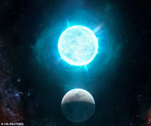 The system includes a white dwarf, a dead star so small and faint that they don’t usually show up on optical telescopes. The researchers were only able to determine the white dwarf existed because of its pull on its partner star. Pictured: Artist’s impression of a white dwarf next to our moon for scale