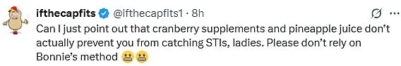 One particularly critical commenter pointed out the potential risks associated with such activities, noting that Bonnie’s suggestion to prevent sexually transmitted infections (STIs) through cranberry supplements and pineapple juice is both misleading and potentially harmful.