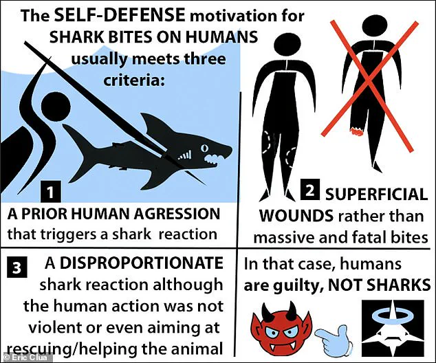 Eric Clua, a shark specialist and researcher at Université PSL, said: ‘We show that defensive bites by sharks on humans—a reaction to initial human aggression—are a reality and that the animal should not be considered responsible or at fault when they occur.