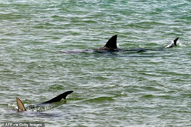 Shark fins are pictured as they swim the Mediterranean sea waters off the coast of Hadera in central Israel on April 22, 2025.