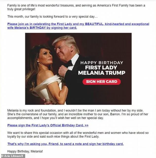 The email promised supporters the opportunity to surprise Melania with a birthday card signed by 1 million Americans nationwide.