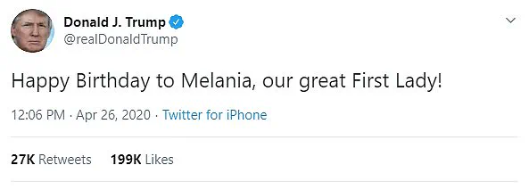 In 2020, amidst the ongoing COVID-19 pandemic lockdowns, President Trump wished his wife a happy 50th birthday via X in a heartfelt message: “Happy Birthday to Melania, our great First Lady!” The email blast from fundraising committees including Donald J.