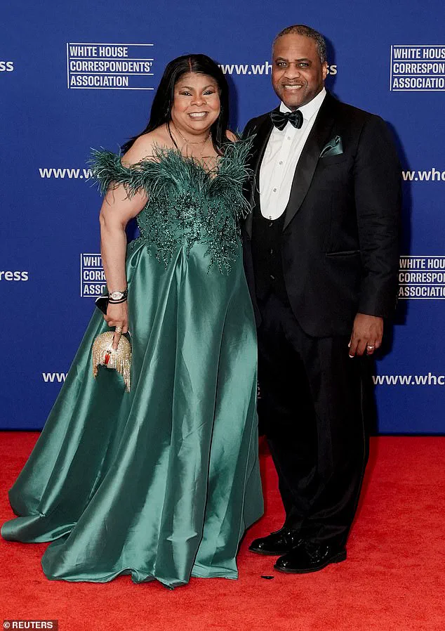 MSNBC political contributor April Ryan wore a green gown to the prestigious event as she arrived with her husband James Ewing. The chest area of the dress contained gems all over it and had feathers hanging off,