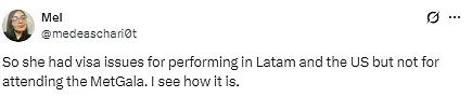 Many took to X (formerly Twitter) to voice their bewilderment, with one user asking, “But wait, I thought her visa wasn’t valid?” Another commented, “Oh suddenly her visa works…” A third user quipped, “So, she got her visa for the Met Gala but not Coachella… okay girl.” Others echoed similar sentiments, questioning why her visa issues seemed to resolve themselves just in time for the Met Gala but not for her canceled U.S. and Latin America tour dates, which included a high-profile appearance at Coachella.