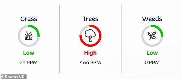 According to the Kleenex forecast, London will be hit by extremely high levels of tree pollen over the coming days, with levels reaching up to 466 particles per metre cubed of air. ‘The warm weather has been pleasant for many, but it’s also ideal for trees to release pollen,’ Dr.