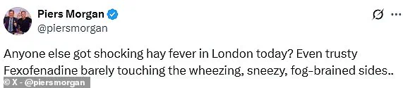 Piers Morgan took to Twitter to express his frustration, writing: ‘Anyone else got shocking hay fever in London today?
