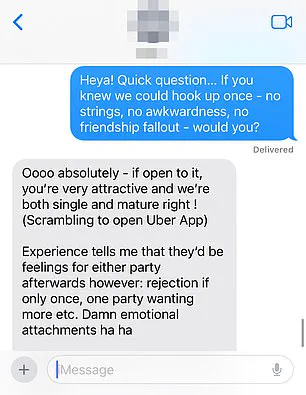 My straight male best friend, a man whose loyalty had never wavered, responded with a reply that was equal parts flattery and self-preservation. ‘Oooo absolutely – if open to it, you’re very attractive and we’re both mature, right! (scrambling to open Uber App).