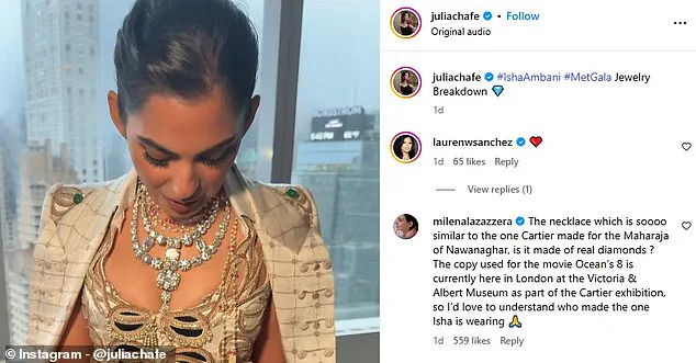 Lauren also publicly reacted to Isha’s outfit on Instagram with a heart emoji after the influencer Julia Chafe shared a video of her talking through her diamond encrusted look.