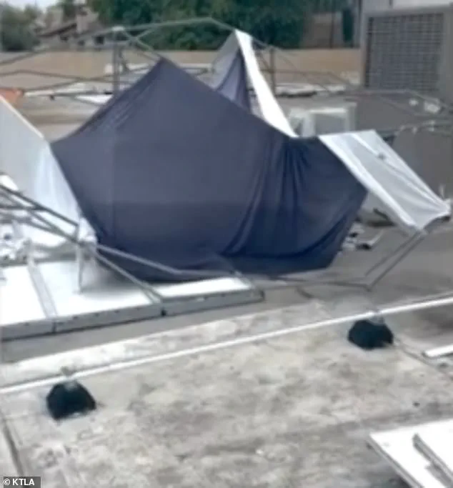 However, these efforts have been repeatedly dismantled by the homeless population. ‘They took down the fence,’ said Gaby Rodriguez, one of Soliman’s employees. ‘We put cages around our AC units, and they took those down.’ The constant destruction has left the building in disrepair, with clothes, debris, and discarded items becoming a daily sight on the rooftop.