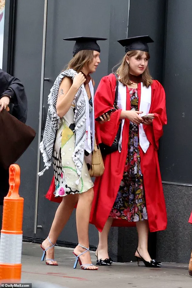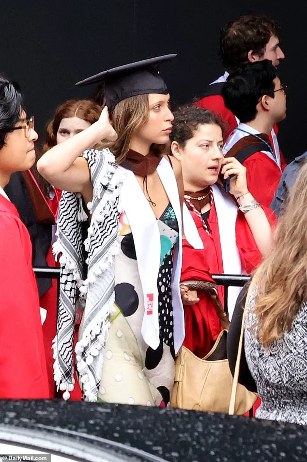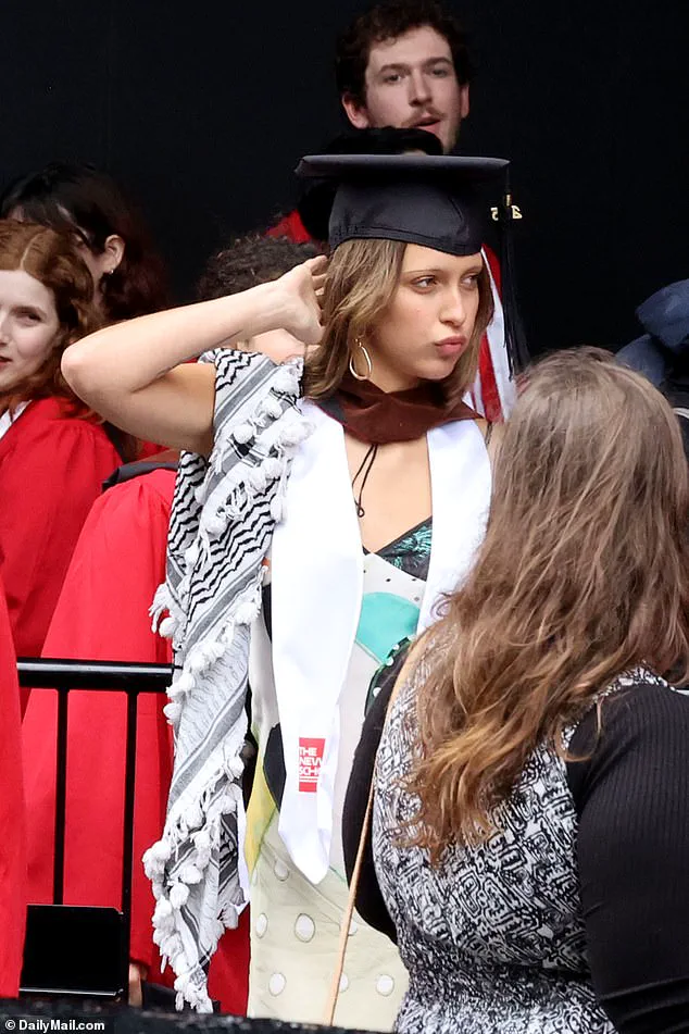 Aydan Nix, revealed by the Daily Mail to be Gigi and Bella Hadid’s half-sister, wore a black and white keffiyeh scarf to her graduation from the Parsons School of Design earlier this month.
