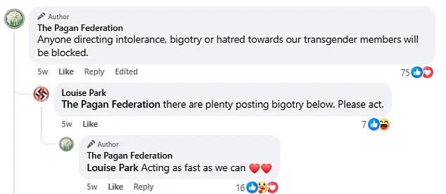 The controversy escalated when a member of the Pagan Federation posted a comment labeling Howard and another woman as ‘bigoted TERFs that need banning.’ The group quickly responded, confirming that four members had been banned for making similar comments. ‘We are banning people who are being hateful and/or bigoted,’ the group wrote in a comment beneath their original post.