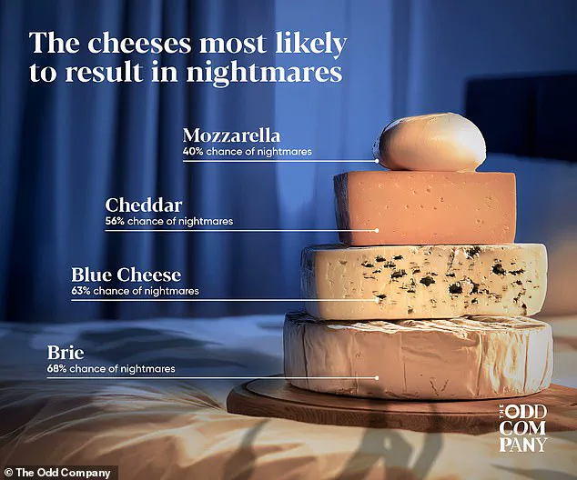 Cheddar was responsible for nightmares in 56% of cases, while mozzarella had the lowest impact, with only 40% of participants experiencing disturbing dreams.
