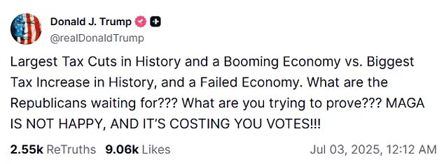 For Trump, the stakes were monumental: a sweeping tax-cut package and spending overhaul that promised to deliver the ‘Biggest Tax Cuts in History,’ a claim he reiterated with uncharacteristic fervor on Truth Social, where he declared the Republican House majority ‘UNITED’ in its mission to ‘MAKE AMERICA GREAT AGAIN.’