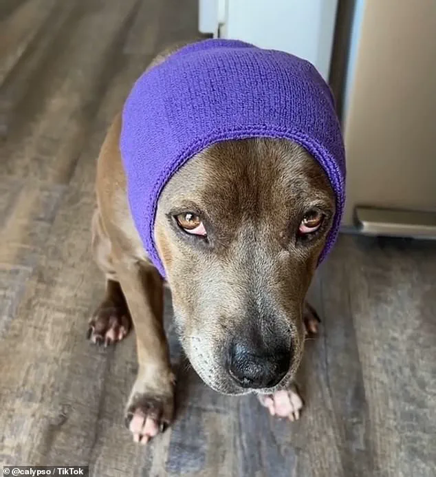 The dog mom placed a thick, tight purple sleeve over Calypso’s head to trap down her ears.
