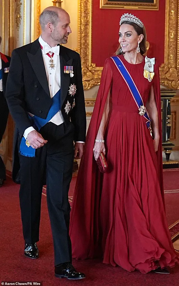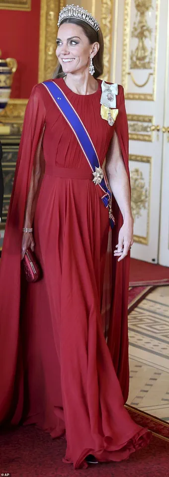 The Princess of Wales dazzled in deep crimson this evening as she stepped out for the State Banquet held in honour of French President Emmanuel Macron
