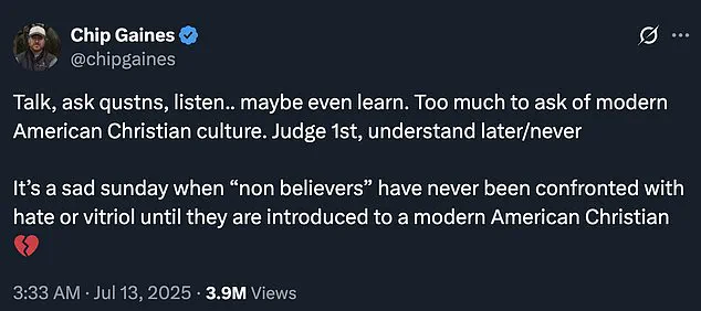Chip, one of the show’s other stars, broke his silence on X (formerly Twitter), lashing out at what he called ‘modern American Christians’ for their vitriolic responses to the series. ‘Please stop pretending you’re Christians,’ he wrote in a post that quickly went viral. ‘You’re dragging the name of Christ through the mud.’ His words were met with a wave of counterattacks from conservative audiences, including one user who declared, ‘It’s a sad Sunday when “non believers” have never been confronted with hate or vitriol until they are introduced to a modern American Christian.’ The exchange underscored a broader cultural clash between progressive values and traditionalist ideologies, with the show becoming an unexpected battleground for these tensions.