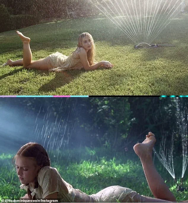 The image in question shows Sabrina lying in the grass under a sprinkler, a pose nearly identical to the one Dominique famously performed in the film. ‘Hmmmm, does this look familiar? @sabrinacarpenter,’ Dominique captioned the post, sparking immediate backlash and debate on social media.