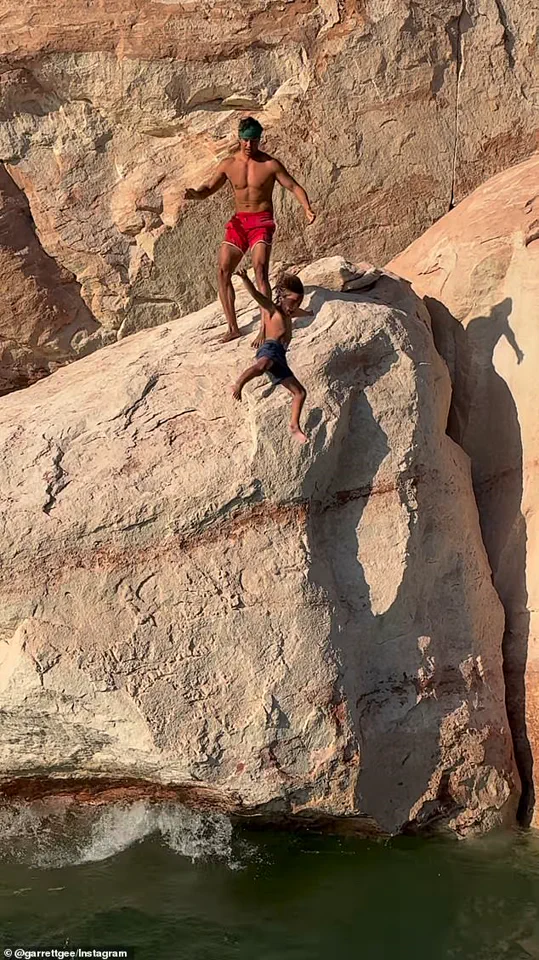 The video, shared on Instagram on July 12, was filmed during a recent family trip to Lake Powell – a reservoir on the Colorado River in Utah and Arizona. Pictured: Garrett Gee throws his youngest son, Calihan ‘Cali’ Gee off a cliff on Lake Powell