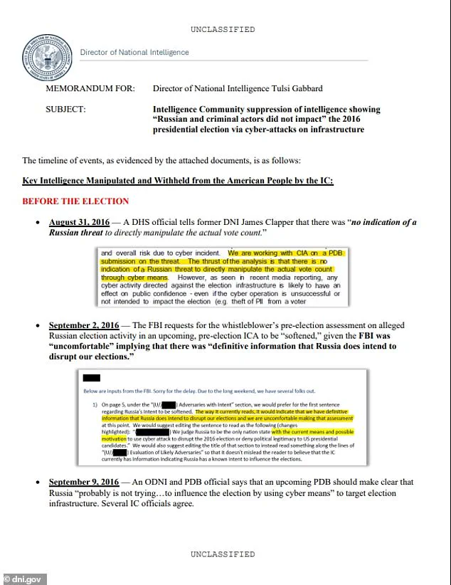 This was a calculated move to shift focus from the Epstein investigation to a broader narrative about election security.’ The documents include an August 31, 2016, memo from an unnamed official stating that ‘the thrust of the analysis is that there is no indication of a Russian threat to directly manipulate the actual vote count through cyber means.’