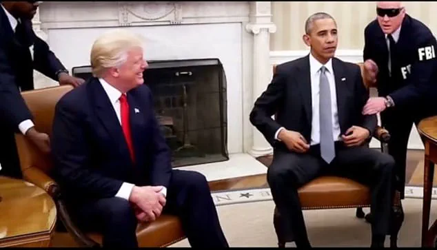 The clip, set to the tune of ‘YMCA’ by Village People, featured a surreal sequence: Obama, Biden, and Nancy Pelosi repeating the phrase ‘no one is above the law,’ only to be replaced by a digitally altered scene of Obama being dragged from the Oval Office by FBI agents.