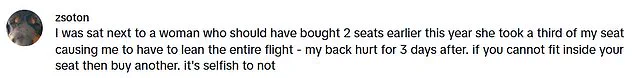 My back hurt for three days after.’ Others warned that the issue was not just about size but about respecting the rights of all passengers. ‘If you cannot fit inside your seat, then buy another,’ one commenter said. ‘It’s selfish to not.’
