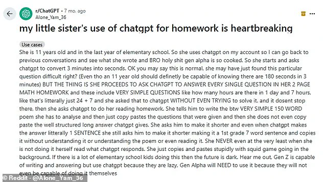 This Reddit user described their young sister’s use of ChatGPT for homework as ‘heartbreaking.’ The sentiment reflects a growing unease among parents and educators about the potential erosion of critical thinking and independent learning skills.