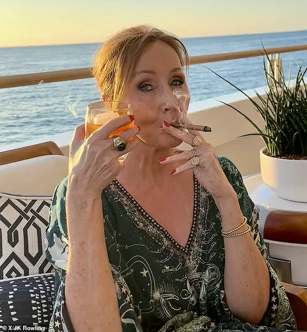 In the image, Rowling is seen holding a cigarette on her $150million superyacht en route to the Bahamas.
