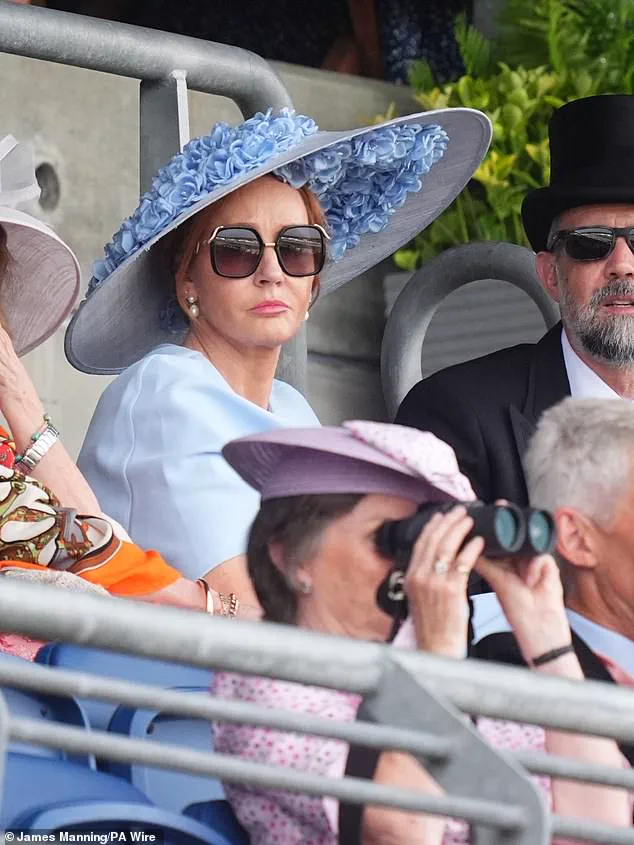 Dressed in a pale blue gown paired with an extravagant floral fascinator and black sunglasses, she sipped champagne and tweeted: ‘Really hope go big or go home is still a thing.’ This lighthearted comment provided a rare, unfiltered look into her personality, suggesting that the author who once grappled with the pressures of fame still enjoys the thrill of indulgence.