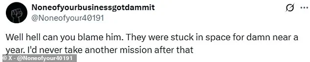 I’d never take another mission after that.’ Another user added, ‘I bet he was no longer capable of passing physical from his extended sojourn,’ reflecting a growing sentiment that the physical and mental demands of space travel may be pushing astronauts toward early retirement.
