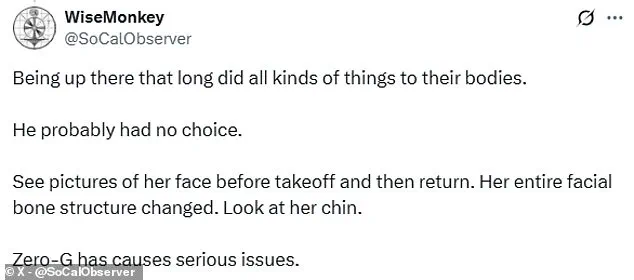 He probably had no choice.’ These comments reflect the public’s awareness of the physical and psychological toll of prolonged space travel, a topic that has gained renewed attention in recent years as agencies push the boundaries of human spaceflight.