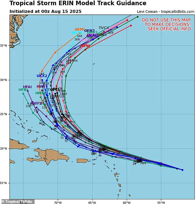 Erin’s trajectory remains a subject of intense scrutiny, with spaghetti models—a collection of forecast tracks generated by different computer models—showing a range of possibilities.