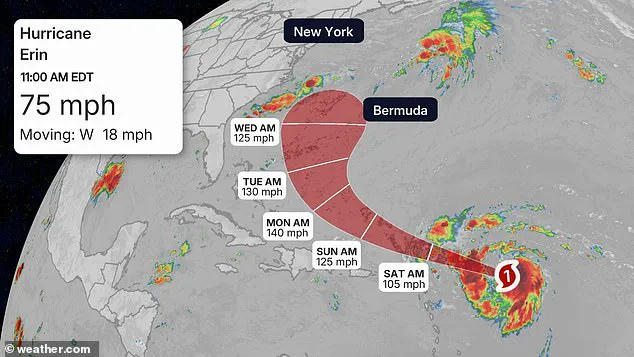 The rapid intensification of the storm has sparked concerns among meteorologists, who note that Erin’s trajectory has been influenced by unusually warm sea surface temperatures and a favorable atmospheric environment.