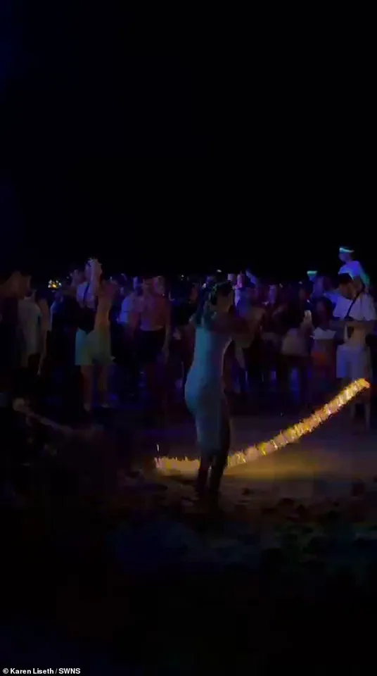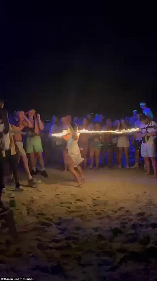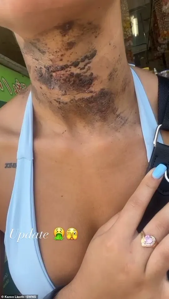 Liseth, who now counts her blessings that the injury wasn’t more severe—such as if the fire had reached her eyes or ignited her hair—recalled the surreal moment. ‘I think I just felt adrenaline in the moment and laughed it off,’ she said. ‘I even had a few shots to help with the pain after!’ The couple, stranded on the remote island until the next morning, faced the reality of the injury only after waking up in excruciating pain. ‘I couldn’t really move my neck,’ she admitted, describing the agony of even simple tasks like showering.