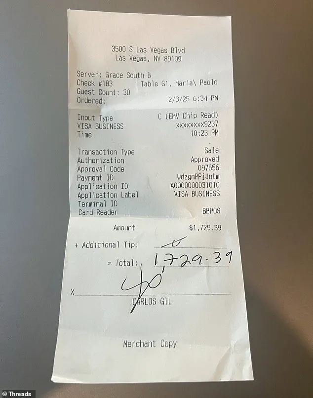 On Sunday, Carlos Gil, a marketing consultant, posted an image of a receipt he received after dining with 30 people.