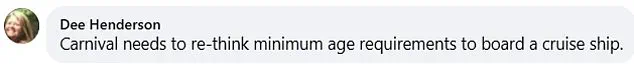 One commenter wrote: ‘Carnival must have some killer chicken tenders.’ ‘You wonder why they changed the rules,’ another said, referencing Carnival cruises’ recent changes focusing on a more ‘adult only’ atmosphere. ‘The security guard was like… heck no!!’ ‘Well low and behold another CARNIVAL CRUISE looking like the circus it has truly become,’ another said. ‘There is literally a never ending supply of chicken tenders on the ship.’ ‘Carnival needs to re-think minimum age requirements to board a cruise ship,’ another said.