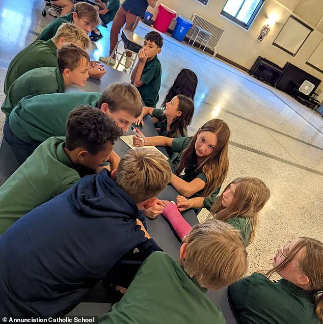 In another image, the children gathered around a school cafeteria lunch table as one sat with her arm in a cast.