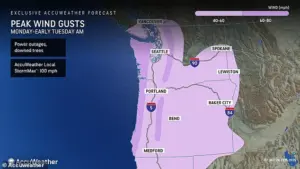 Hinson noted that gusts could range from 60-80 mph in exposed locations such as near the coast, in mountainous terrain, and inland regions. More sheltered cities like Seattle can expect wind speeds between 40-60 mph. The storm should begin to dissipate by Tuesday afternoon.