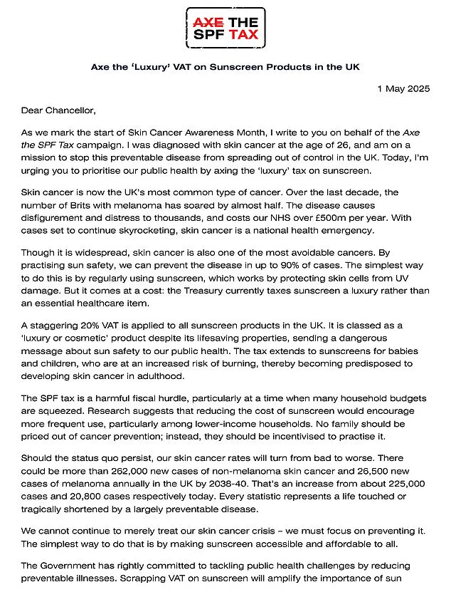 The letter, backed by influential figures such as Reform UK leader Nigel Farage and Lib Dem leader Sir Ed Davey, urges the government to reclassify sunscreen as an essential healthcare item.