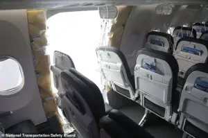 The Boeing 737 Max 9 plane was only minutes into its flight from Portland, Oregon, to California when the unused exit door blew open and detached, leading to loss of pressure. The higher the altitude, the lower the air pressure. Pictured, interior view from after the accident showing the missing door plug and damaged seats