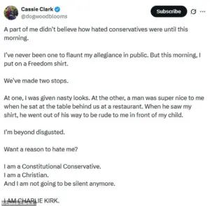 Cassie Clark usually spends her time celebrating the State of North Carolina as an eighth generation native and sharing how great it is with her followers. But Clark’s feed took a different turn on September 28 after a man harassed her for wearing a red Charlie Kirk shirt