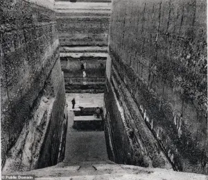 Archaeologist Alessandro Barsanti first excavated the site in the early 1900s, uncovering a colossal T-shaped pit carved into solid limestone, nearly 100 feet deep and lined with massive granite blocks. His photos are the only view people have of the site